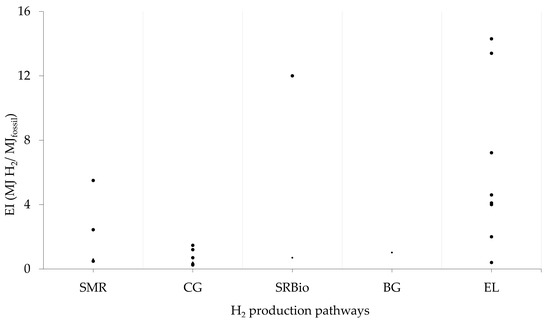 Energy performance of H2 production systems. SMR: steam methane reforming; CG: coal gasification; Bio (SREtOH, SRBiogas, and biogas gasification); EL: water electrolysis. The energy indicator (EI) was estimated by the authors based on a low heat value (LHV) of H2 (EI = LHV H2/CEDfossil).