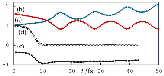 The model system consists of a quercetin anion, dissociated at 4′-OH (Qˉ(4′)) or 7-OH (Qˉ(7)), in a ~22.7 Å × 22.7 Å × 22.1 Å box solvated with 405 water molecules. Initial cell size optimization and geometry optimization of the molecules in the box was performed using the CP2K code [49]. The PBE functional [50], GTH pseudopotential [51], Grimme’s D3 dispersion correction [52], and TZVP-MOLOPT and DZVP-MOLOPT base sets for quercetin and water, respectively [53], were used with a 260 Ry cutoff for the grids and periodic boundary condition (PBC) applied. The systems were thermally equilibrated with an NVT Nose–Hoover thermostat at 300 K and 1 bar with a step of 0.5 fs. In the obtained thermally equilibrated systems, the hydroxyl radical was produced by the deletion of a H atom from one water molecule around the quercetin anions, a total of 26 positions for Qˉ(4′) and Qˉ(7) each. The local spin density approximation was applied, and the charge and multiplicities were −1 and 2, respectively. Molecular dynamics simulations were performed with an NVT Nose–Hoover thermostat at 300 K and 1 bar with a 0.5 fs step. For simulations in which hydrogen atom transfer from the quercetin anion was observed, the structures of the quercetin anion, hydroxyl radical, and surrounding waters were extracted from the trajectories. Single-point calculations with GAUSSIAN 16 software [54] at the unrestricted ωB97X-D/def2-TZVP level were performed on these structures and trajectories to obtain wave functions. Intrinsic bond orbital analysis and the IBO localization procedure on these wave functions were performed with the IBOVIEW program [47].