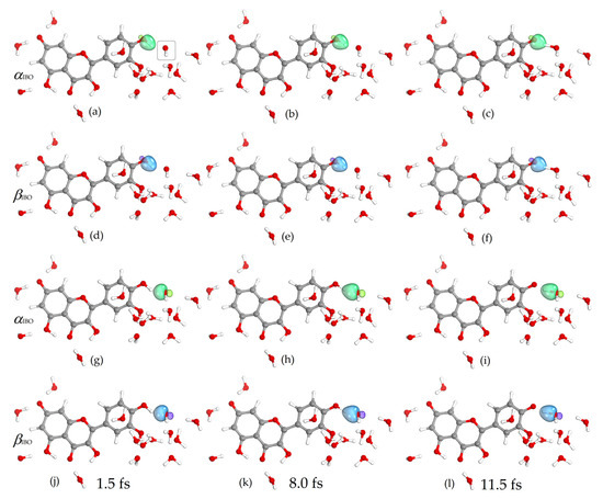 In the MD simulations performed, the hydrogen atom transfer reaction occurred when the hydroxyl radical was initially located in the hydrophilic regions around the quercetin anion [55]. The reaction occurred at 4′-OH and 3′-OH in the case of Qˉ(7′) and at 7-OH and 3′-OH in the case of Qˉ(4). These hydroxyl groups of the quercetin anions were also shown to be reactive in the Car–Parrinello molecular dynamics study of the reaction of quercetin anions with the superoxide radical [56]. The reaction proceeded rapidly when the hydroxyl radical was initially located close to the quercetin anion, and when it was located further away, the reaction occurred if the surrounding water supported efficient hopping in a mechanism similar to Grotthuss’s. A similar pattern was also observed in molecular dynamics simulations of quercetin anions with the superoxide radical [56], hydroxyl radical with gallic acid [57], ascorbate [58], and dopamine [59]. Figure 2 shows changes in bond distances, charge, and spin in an example simulation of the reaction of the quercetin Qˉ(7) anion at 4′-OH with a nearby hydroxyl radical. The reaction took place quickly, and the proton was located in the middle between the 4′-O donor and the hydroxyl radical acceptor in 11.5 fs. During this time, the IBO spin of the O atom of the hydroxyl radical changed from about 1 to 0 and the IBO charge changed from about −0.35 to −0.92, indicating electron acceptance. The changes in IBOs involved in this process are shown in Figure 3 and Figure 4. In the figures, the IBOs of α and β electrons are shown in green and blue, respectively, and the columns correspond to times of 1.5, 8.0, and 11.5 fs. At the beginning of the simulation, α and β electron IBOs can be identified, corresponding to the aromatic group of the Qˉ(7) anion, (a) and (d), the unpaired electron (g), and the lone pair of the hydroxyl radical, (j) and (m) (Figure 3). During the simulation, the change in β IBO follows the electron flow from the aromatic β IBO (d) to the lone pair of the hydroxyl radical (f), while α IBO remains on the aromatic group representing the unpaired electron of the formed quercetin radical (c).