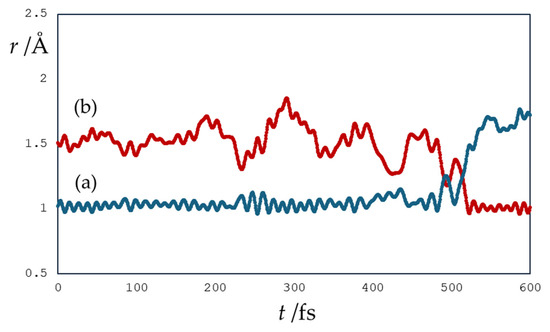 Changes in (a) proton donor and H atom distance (in Å) and (b) proton acceptor and H atom distance (in Å) in an example simulation of the reaction of the quercetin Qˉ(4′) anion at 7-OH with a distant hydroxyl radical separated by 3 water molecules.