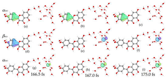 Figure 5 shows the changes in the OH bond distances of the proton donor and acceptor in the simulation of the reaction of the quercetin Qˉ(4) 7-OH with a distant hydroxyl radical separated by three water molecules. The IBO analysis shows that the electron transfer occurred rapidly in 167 fs, while the proton transfer occurred later. The proton was located between the Qˉ(4) 7-OH donor and the acceptor water molecule in 515 fs. The α and β IBOs involved in electron and proton transfer are shown in Figure 6 and Figure 7, respectively. For electron transfer, a β electron from the π aromatic bonding orbital, α (a) and β (d) IBOs in Figure 6, jumps into the unpaired electron orbital of the hydroxyl radical, α (g) IBO, resulting in the formation of a lone electron pair of the hydroxide anion, as indicated by the change in spin and charge, α (e) and β (h) IBOs (Figure 6). The formed quercetin radical slowly transfers a proton from the 7-OH group to a nearby water molecule and is further transferred to the hydroxide anion by reorganization of hydrogen bonds in a Grotthuss-like mechanism, as shown by IBO analysis (Figure 7). In this case, the simulation shows that the hydrogen atom transfer occurs by a stepwise electron transfer–proton transfer (ET-PT) reaction mechanism. It is worth noting that quercetin radicals, the products in these simulations, experimentally generated by photoionization and spectroscopically characterized by transient absorption spectroscopy, were found to be stable for several milliseconds within a pH range between 2 and 9 [61].