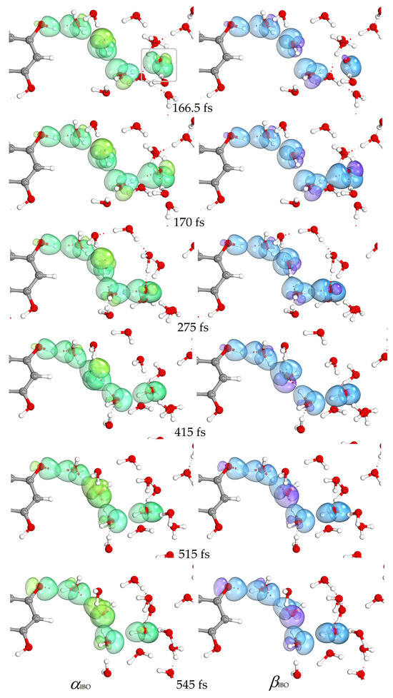 Changes in α (green) and β (blue) IBOs involved in electron transfer for the reaction of the quercetin Qˉ(4′) anion at 7-OH with a distant hydroxyl radical (marked) at 166.5, 167, and 175 fs. See also Video S3 in Supplementary Materials.