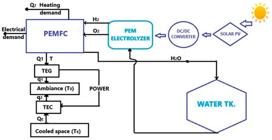 Another study introduces a hybrid poly-generation system that utilises waste heat from fuel cells to generate electricity. The configuration comprises a solar photovoltaic system, fuel cells, and a thermoelectric device. This proposed system can provide electrical, thermal, and cooling requirements. A proton exchange membrane electrolyser (PEMWE) is used to provide the fuel and oxidant required for the fuel cells, with the electrical power needed for the electrolyser being supplied by the solar photovoltaic system. The heating and cooling demands are provided by the proton exchange membrane fuel cells (PEMFC) and a thermoelectric cooler (TEC), respectively. Figure 2 shows the schematic diagram of a hybrid system capable of generating power, hydrogen, heating, and cooling. In this system, the power produced by the photovoltaic panels is supplied to the electrolyser to produce hydrogen. The oxygen and hydrogen thus obtained feed the cathode and anode of the fuel cell, respectively, resulting in power and heat. The DC electrical power received from the PEMFC (WDC, PEM) is converted into AC electrical power (WAC, PEM) by the inverter. The heat from the fuel cell (QPEM) is also divided into two parts: one part (Q1) at temperature T is transferred to the TEG module to produce additional electrical power, and the other part (Q2) can be used for heating demands. Then, the electrical power produced by the TEG is transmitted to the TEC module, which absorbs the heat of the cooled space (QC) at temperature TC, thus providing the required cooling load. The water obtained from the PEMFC is also transferred to the water tank to feed the electrolyser [].