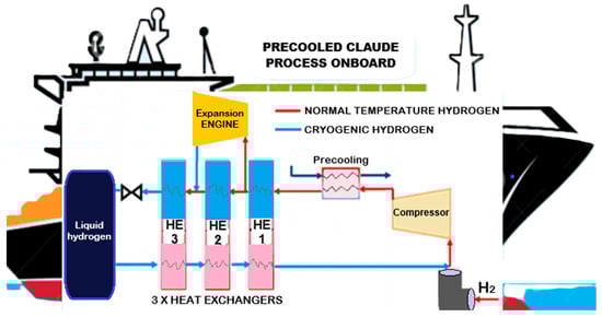 The widespread adoption of hydrogen requires a diverse range of hydrogen storage and transportation systems. Liquid hydrogen exhibits high potential for efficient storage and transport due to its high gravimetric and volumetric energy density and purity. Hydrogen liquefaction with high energy efficiency (low specific energy consumption) needs to be intensively developed to achieve a specific energy consumption of approximately 5–6 kWhel/kg-H2 shortly, thereby significantly reducing the total cost of liquid hydrogen production, storage, and transport. Storing hydrogen in liquid form is possible below 252.8 °C. Under these conditions, “the density of liquid hydrogen reaches up to 70.85 kg/m3, approximately 848 times higher than the density of hydrogen gas” []. There are several methods for liquefying hydrogen, including the Linde–Sankey process, the Claude process, the Collins process, and the Brayton helium cycle. According to research in the literature, in the 2010s, the Claude process for precooling hydrogen was preferred (Figure 5), a process that can be researched and developed on board ships using hydrogen energy. The Claude process involves a set of heat exchangers integrated into the system, one of which is used to precool the compressed hydrogen. This hydrogen passes through a heat exchanger, and part of the gas enters the expander, where it is expanded and cooled, contributing to the overall cooling process of the hydrogen. After three heat exchange processes, the hydrogen passes through an expansion valve and is stored as liquid hydrogen [].