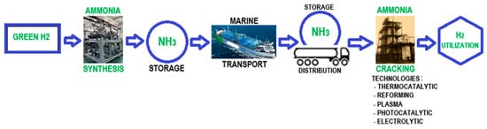 With a boiling point at atmospheric pressure of –33.5 °C, liquid ammonia storage is energy-efficient, with a hydrogen storage capacity reaching 123 kg H2/m3, compared to only 70.8 kg H2/m3 for liquid hydrogen []. Ammonia has attracted attention as an hydrogen carrier in the case of long-distance maritime transport; the value chain (Figure 6) includes NH3 synthesis from green hydrogen, the storage of liquid NH3 at the loading terminal, and the storage of NH3 at the unloading terminal, followed by distribution and cracking (via various technologies) to release H2 for further use [].