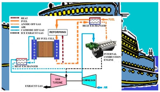 - Sapra, H.; Stam, J.; Reurings, J.; van Biert, L.; van Sluijs, W.; de Vos, P.; Visser, K.; Vellayani, A.P.; Hopman, H. Integration of solid oxide fuel cell and internal combustion engine for maritime applications. Appl. Energy 2021, 281, 115854. [Google Scholar] [CrossRef]