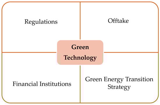Although renewable energy resources are variable renewable energy systems (VRESs) in nature, they can leverage electrolyzers that can operate at lower temperatures (20–100 °C), like the Polymer Electrolyte Membrane (PEM) [8]. However, this does not imply that other electrolyzers operating at higher temperature ranges cannot be utilized. Furthermore, financial institutions typically evaluate and negotiate project financing based on detailed projections of future returns. These assessments often include the anticipated revenue streams from offtake agreements, projected internal rate of return (IRR), payback period, and net present value (NPV) of the project. Additionally, several other factors contribute to a project’s financial attractiveness, including its geographic location, prevailing market conditions (such as electricity prices and hydrogen demand), regulatory stability, and perceived risks related to infrastructure, policy, and technology readiness [9]. The key factors supporting technology’s critical role in hydrogen development include favorable green hydrogen regulations, promising offtake, tested and reliable technology, green energy transition strategies, and financial institutions to achieve a resilient business model. Figure 1 shows how these elements interact with each other.