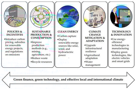 Financing to achieve a green economy is referred to as green financing. The United Nations Environmental Programme (UNEP) defines green financing as an increase in the level of financial flow (from the banks, micro-credit, insurance, and investment) from the public, private, and not-for-profit sectors to sustainable development priorities [13]. It may incorporate grants, loans, investments, or debt mechanisms that decarbonize economies or limit the effect of climate change. To achieve green economies in SSA, and to attain self-sustainability, linking green finance with policy reforms is critical. Such innovative approaches would support governments in formulating sound green policies for a green economy and conjointly developing strategies that build responsive financial investment systems that are sustainable [14,15].