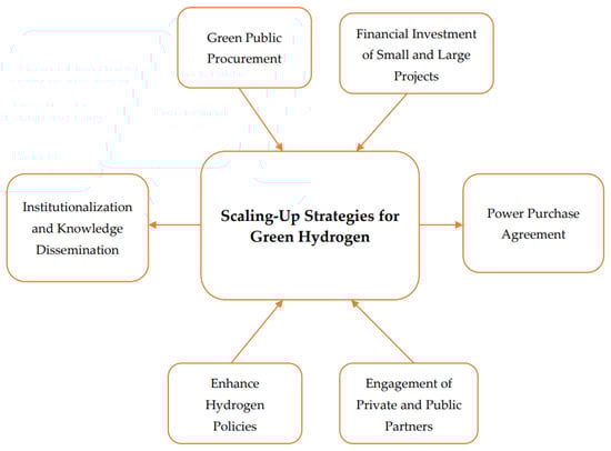 Lowering production costs will enable large-scale manufacturing, including reducing expenses for solar power and electrolyzers. Increased funding will enhance investments and support infrastructure development. Advanced, affordable green hydrogen infrastructure combined with demand will drive the growth of the green hydrogen economy [55]. Enacting policies such as green public procurement and promoting public–private partnerships will also bolster this growth. To further cultivate the green hydrogen economy, implementing strategic procurement practices is essential.