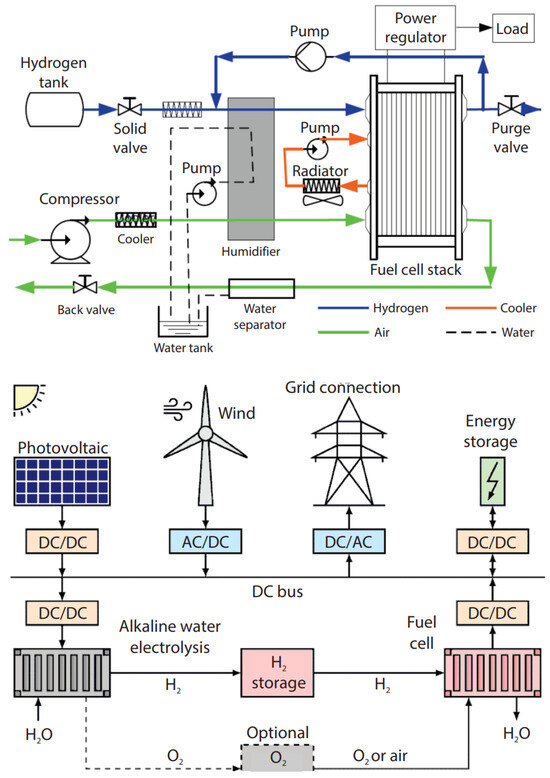 Figure 3 illustrates the integration of fuel-cell systems at both the vehicle and energy network levels. The top schematic shows a vehicle PEMFC system where hydrogen from the storage tank and compressed air are supplied to the fuel-cell stack, producing electricity, heat, and water, with balance-of-plant components such as pumps, humidifiers, coolers, radiators, and purge valves ensuring proper thermal, water, and reactant management. The bottom schematic highlights how hydrogen can be produced via electrolysis using renewable sources such as solar and wind, stored, and later utilized in fuel cells to supply electricity back to the grid or vehicle, demonstrating hydrogen’s role as an energy carrier that links intermittent renewables with end-use applications. Together, the diagrams emphasize that system scalability requires efficient balance-of-plant management, temperature control is critical to performance and durability, and techno-economic considerations remain central to achieving cost-effective deployment of large-scale hydrogen and fuel-cell systems.