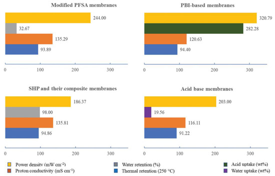 Figure 4 shows various membranes of proton exchange used in HT-PEMFCs, with all parameters’ average values derived from an analysis of ten randomly selected articles [
