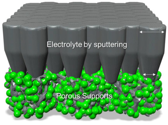 Figure 11 depicts a thin-film SOFC, where the gas-tight electrolyte diameter columns increase with thickness. The white arrow designates the column diameter, which expands as the thickness gets bigger, resulting in residual compressive stress within the film.