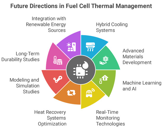 The future of thermal management in fuel cells, particularly for PEMFCs and SOFCs, is ready to evolve significantly, driven by advancements in technology, materials, and computational techniques. As fuel-cell technologies become increasingly integral to the transition to clean energy systems, a concerted effort is needed to explore and refine thermal management strategies. Several key research directions can be identified to improve fuel-cell performance and reliability.