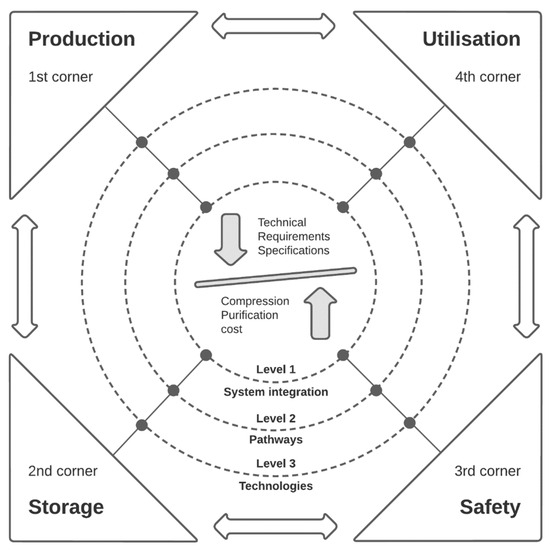 The four-corner model represents hydrogen production, storage, safety, and end-use as interdependent dimensions. Each corner highlights a critical challenge: (i) production methods define the environmental footprint, (ii) storage determines energy density and logistical feasibility, and (iii) safety addresses material durability and handling risks, while (iv) end-use technologies specify efficiency and applicability. Considering these four aspects together allows for a systemic interpretation of hydrogen pathways, which is why the HydS is presented as part of the framework.