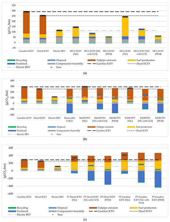 Comparison of Lifetime CO2 Emissions [gCO2e/km] Across Vehicle Powertrains Including Fossil-Fueled, Electric, and Alternative Fuel Options: (a) Hydrogen-Powered FCEVs and ICEVs, (b) Renewable CNG and Alcohol (E-Fuel) Vehicles, and (c) Fischer–Tropsch Diesel and Gasoline (E-Fuel) ICEVs.