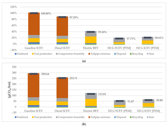 Comparison of Lifetime CO2 Emissions from Green Hydrogen-Powered FCEVs and ICEVs Relative to Fossil-Fueled and Electric Vehicle Benchmarks—(a) Expressed as Percentage of Gasoline ICEV Emissions, (b) Expressed in Absolute Terms [gCO2e/km].
