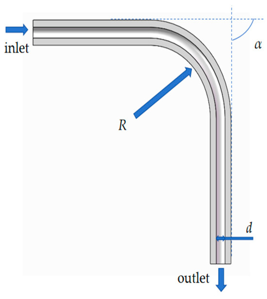 For the hydrogen fuel aviation engine, the hydrogen was transferred to the combustor through the bend tube of the stainless steel. A typical bend tube of 316 L stainless steel with a density of 8027 kg/m3 at 25 °C was analyzed in this study and the effect of the geometry parameters on the erosion behavior was investigated, as shown in Figure 1. The length of the straight tube on both sides of the bend was 50 mm and the thickness of the tube was 0.5 mm. Hydrogen of 99.99% purity was treated as a compressible ideal gas whose density and dynamic viscosity at 25 °C were 8.189 × 10−3 kg/m3 and 8.411 × 10−6 kg/(m·s).