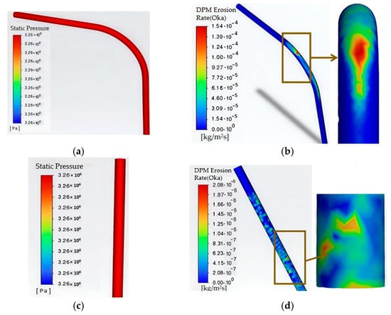(a) Pressure of bend tube; (b) erosion rate of bend tube; (c) pressure of straight tube; (d) erosion rate of straight tube (d = 3 mm, V = 170 m/s, R = 23.7 mm, α = 90).