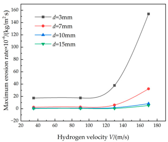 The effect of hydrogen velocity on the maximum erosion rate is shown in Figure 3 and Table 3. With the increased hydrogen velocity, the maximum erosion rate first slightly increases and then increases sharply when the hydrogen velocity exceeds the critical value of 100 m/s to 110 m/s. It shows a power law relationship between the hydrogen velocity and the maximum erosion rate when the hydrogen velocity exceeds the critical value. The erosion rate with a diameter of 3 mm is 1.75 × 10−5 at 35 m/s; it increases to over two times at 130 m/s and it increases about one order of magnitude at 170 m/s. Meanwhile, the critical value decreases with the decreased tube inner diameter, indicating that the smaller tube diameter is more sensitive to the erosion rate. For the bend tube with the small diameter, the gradient of shear stress on the tube surface increased, which increased the erosion efficiency per unit kinetic energy. The threshold under the small diameter was larger than that under the large diameter. With the hydrogen velocity of 170 m/s, the maximum erosion rate is 1.54 × 10−4 at a diameter of 3 mm while it drops to 5.21 × 10−6 at a diameter of 15 mm, resulting in a difference of about 30 times. The kinetic energy of hydrogen increases with the increased velocity and more impact energy is transferred to the surface of the bend tube. Additionally, more hydrogen molecules impact on the tube surface per unit time. At the same time, more particles also contribute to the erosion rate under high hydrogen velocity.