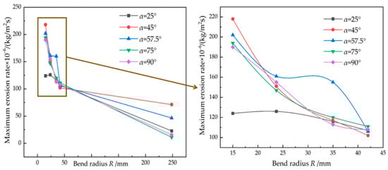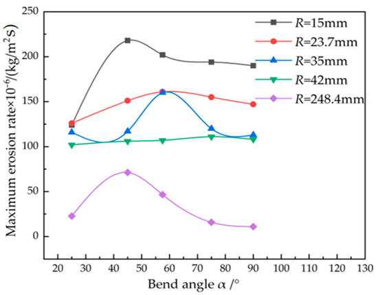 Figure 5 shows the effect of the bend angle on the maximum erosion rate, which is different to the monotonic variation in the bend radius. The maximum erosion rate first increases obviously with the bend angle increasing from 25° to 45~57.5°, then it decreases slightly when the bend angle exceeds the value of 45~57.5°. The degree of change in the flow channel increases obviously when the bend angle increases from 25° to 45~57.5° and the severe phenomenon of secondary flow is generated. Therefore, the probability of mutual collision between the tube surface and the hydrogen as well as the particles increases, resulting in an increased maximum erosion rate. The further increased bend angle inversely decreases the mutual collision of the phenomenon of secondary flow. For the power law fit for the bent tube of 3 mm (R = 23.7 mm, α = 90°), the CI was 95% and the value of R-square was 0.998, which represented a good fit. It can be concluded that the dangerous window of the bend angle is 45~57.5° and it should be avoided for the bending process of the tube.
