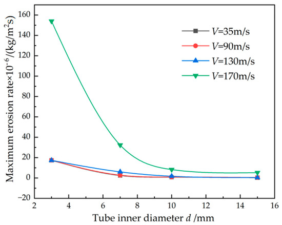 The maximum erosion rate decreases with the increased tube inner diameter, as shown in Figure 7. The descending range is quite large when the diameter ranges from 3 mm to 10 mm and then it is quite small with the further increased diameter. For the constant mass flow rate of the hydrogen gas, the increased diameter significantly decreases the hydrogen velocity. Additionally, the increased diameter also decreases the shear stress on the tube surface of the particles, which also decreases the erosion rate of the tube surface.