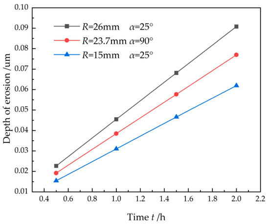 For the actual service of the hydrogen aircraft engine, the hydrogen is the power source and its erosion effect on the bend tube is critical for safety. The effect of the erosion time on the maximum erosion rate is quite important for the prediction of the service life. The experiment of the long-time service of hydrogen erosion is extremely time-consuming and costly. The effect of the erosion time on the maximum erosion rate is shown in Figure 6 and Table 6. It is interesting that there is a linear relationship between the cumulative thickness loss and erosion time under a different bend radius and bend angle. A nanoscale micro-furrow will appear on the tube surface with the hydrogen impact at an early time and then these micro-pits interconnect to form micron-scale spalling pits, thus resulting in obvious erosion and material removal on the tube surface. With the increased erosion time, the vortex intensification effect within the pit further intensifies the local erosion rate. This linear relationship between the maximum erosion rate and erosion time is beneficial for the life prediction of the bend tube under hydrogen erosion, which will be discussed in Section 3.5.