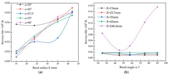 (a) Effect of bend radius on the service life and (b) effect of bend angle on the service life (d = 3 mm, V = 170 m/s).