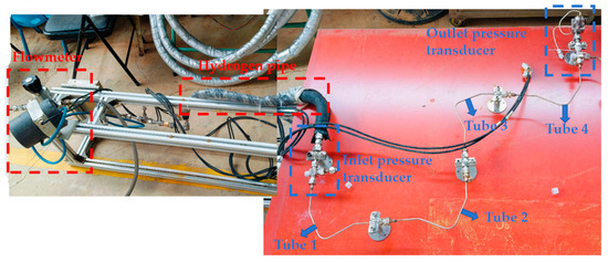 The experimental set-up of the hydrogen erosion process is shown in Figure 12. The inner diameter and thickness of the tube were 3 mm and 0.5 mm. Hydrogen of 99.99% purity was used and the pressure on the inlet was 3.26 MPa. Two pressure transducers were adopted on the inlet and outlet to monitor the pressure. A flowmeter was positioned on the outlet of the hydrogen to monitor the mass flow rate. Four bend tubes of the stainless steel tube were connected with a different bend radius and bend angle. Each bend tube was removed for the analysis of the thickness and hardness after half an hour, and the effect of the erosion time on the variation in the thickness and hardness can be obtained. The experimental parameters were the same as the simulation.