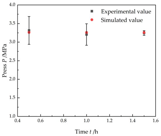 Figure 13 shows the comparison between the experimental pressure and simulated pressure. The simulated value located at the error bar of the experimental value can be seen. The error bar of the experimental value was inevitable during the long-time erosion process of the hydrogen. The pressure during the hydrogen erosion process was monitored and the average value as well as its standard deviation were calculated. The size of the throttle was calculated based on the diameter of the bend tube; however, there are four bend tubes in the experiment. The bend radius and bend angle both affected the flow behavior of the hydrogen, thus changing the pressure in the outlet direction.