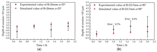 To quantitatively describe the accuracy of the simulated results, the error between the experimental and simulated values was calculated. If the simulated value is located within the error bar of the experimental value, it indicates that the simulation agreed with the experiment. Only when the simulated value was beyond the error bar of the experimental value was the error calculated using Equation (21). Figure 15 shows the comparison between the experimental and simulated erosion depth. Most of the simulated values located within the error bar and the maximum error were 9.4% with the bend radius of 23.7 mm, bend angle of 90° and erosion time of 1.5 h. Therefore, it can be concluded that the simulated results agreed with the experiment.