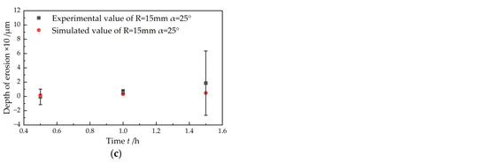 Comparison between experimental and simulated erosion depth: (a) R = 26 mm, α = 25°; (b) R = 23.7 mm, α = 90°; (c) R = 15 mm, α = 25°.