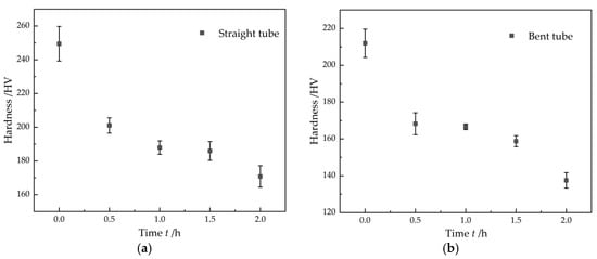 After the measurement of the thickness variation, a Vickers hardness test was conducted using the hardness tester (KHVS-1000MT, Shance, Shanghai, China). The hardness variation for both the straight tube and the bend tube was measured. It was known that the hardness was positively related to the yield strength of the bend tube. Therefore, the hardness measurement was to investigate the variation in the mechanical properties of the bend tube after hydrogen flow. Four points of each sample were tested and the average value as well as its standard deviation were calculated. The load was 500 g and the holding time was 10 s. Figure 16 shows the hardness variation in the straight tube and bend tube under different erosion times. The hardness decreased obviously after the hydrogen erosion process and it slightly decreased further with the increased erosion time for both the straight tube and bend tube. The initial value of the straight tube was 249.5 HV while it was 211.9 HV for the bend tube, indicating that the bend process caused a hardness decrease. The hardness decreased from 249.5 HV to 170.8 HV after erosion for 2 h for the straight tube, resulting in a 31.5% decrease in the hardness. For the bend tube, the hardness decreased from 211.9 HV to 137.5 HV, leading to a decrease of 35.1%. It can be inferred that the bend tube was more sensitive to the hardness decrease after the hydrogen erosion process.
