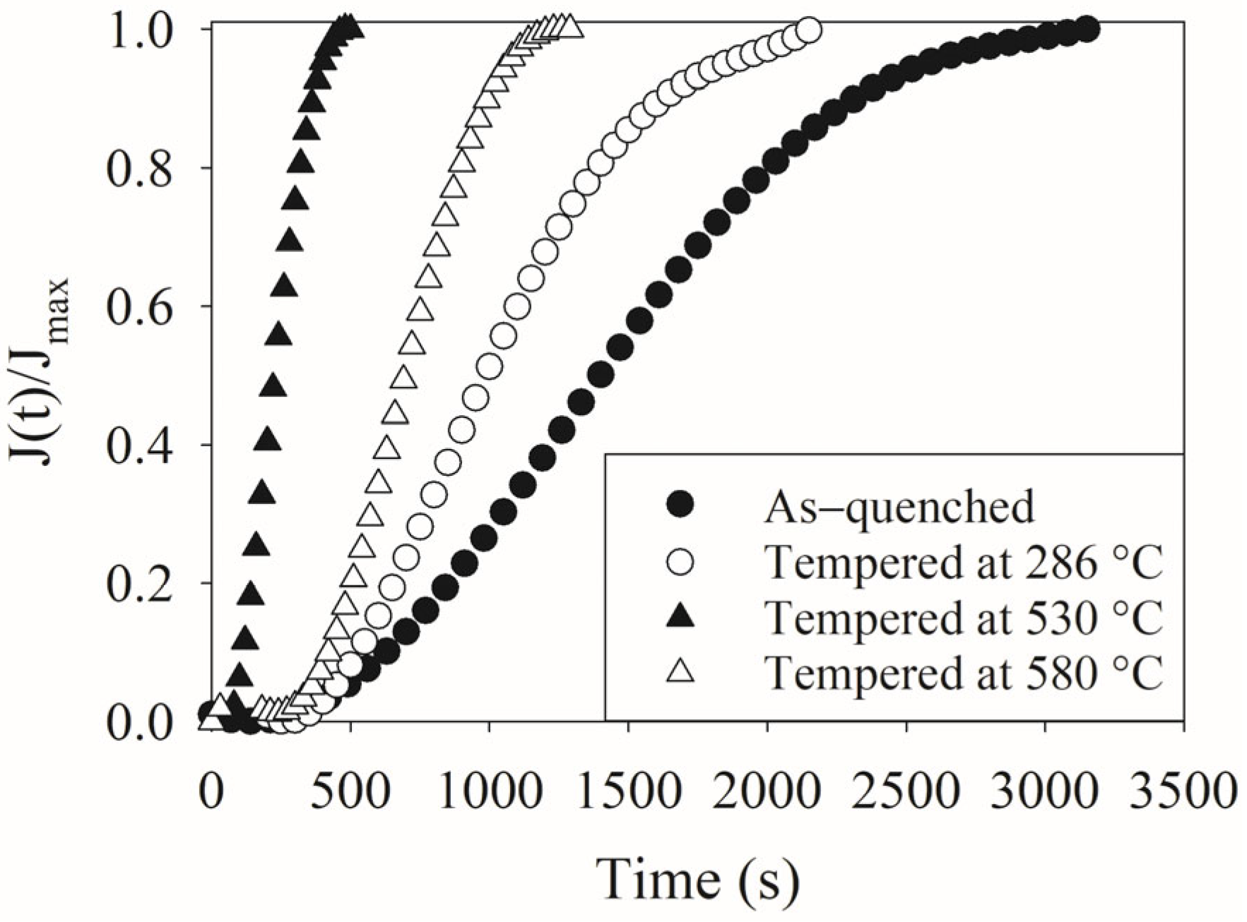 - Van den Eeckhout, E.; Depover, T.; Verbeken, K. The Effect of Microstructural Characteristics on the Hydrogen Permeation Transient in Quenched and Tempered Martensitic Alloys. Metals 2018, 8, 779. [Google Scholar] [CrossRef]