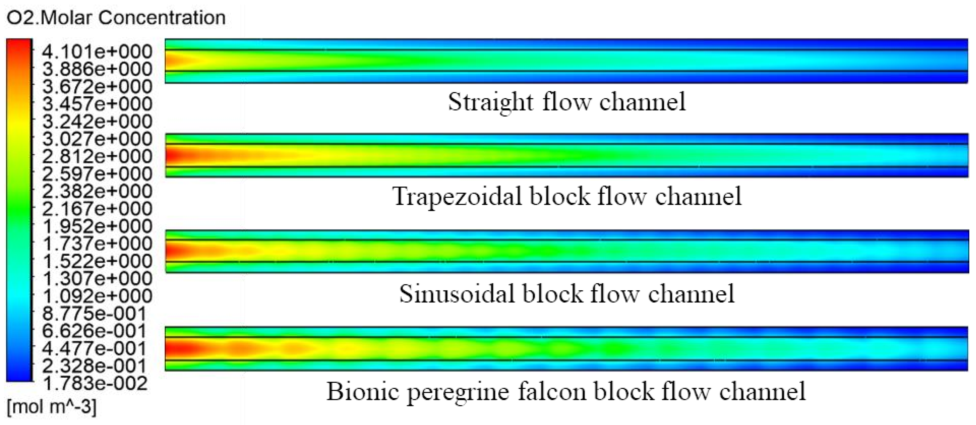 - Compared to the conventional straight channel, the bionic flow field significantly improves oxygen distribution and flow uniformity in the cathode by promoting aerodynamic acceleration and minimizing stagnant zones.