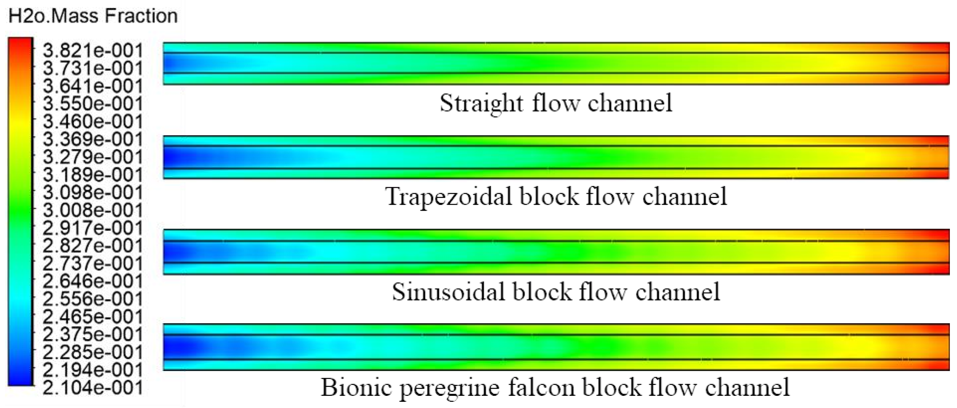 - Analysis of velocity streamlines and oxygen mass fraction contours shows that the bionic geometry enhances convective transport and facilitates effective water removal, particularly near the outlet region.