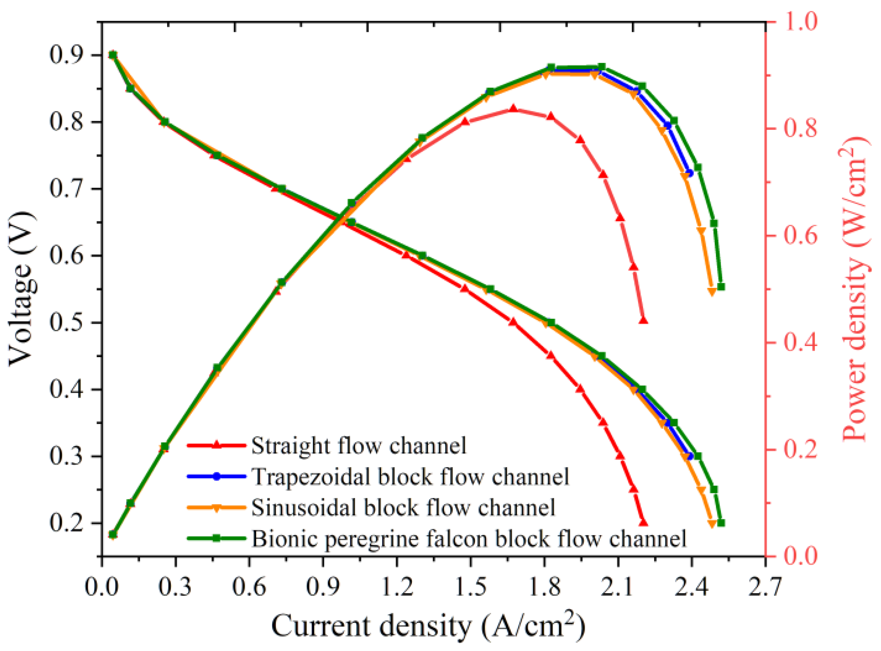 - The falcon-inspired structure increases peak power density by 9.45% while simultaneously reducing pressure drop, demonstrating enhanced electrochemical performance with lower parasitic losses.