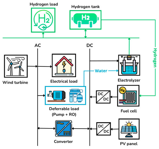Hybrid renewable energy systems (HRESs) address the intermittency of renewables by combining complementary sources such as photovoltaic (PV) and wind power, ensuring a more stable supply [5]. In these systems, solar and wind can offset each other’s fluctuations, with PV panels and wind turbines being the most common technologies. To enhance reliability, storage is essential, with hydrogen increasingly considered a key energy carrier for supporting intermittent resources.