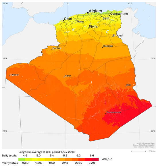 Global Horizontal Irradiance (GHI) distribution across Algeria [31]. Source: Solar resource map © 2021 Solargis (CC BY-SA 4.0), https://solargis.com (accessed on 28 June 2025).