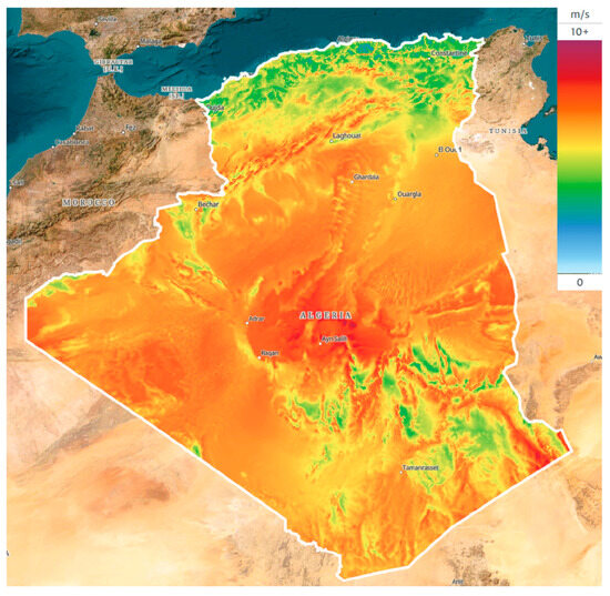 Wind speed distribution at 50 m elevation across Algeria [32]. Source: Global Wind Atlas Technical University of Denmark (DTU), licensed under CC BY 4.0, https://globalwindatlas.info/en/ (accessed on 28 June 2025).