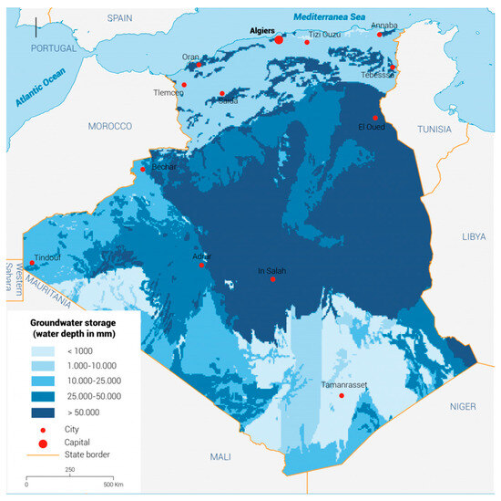 Groundwater storage distribution across Algeria (source: Fanack Water [33], used with permission) (accessed on 28 June 2025).