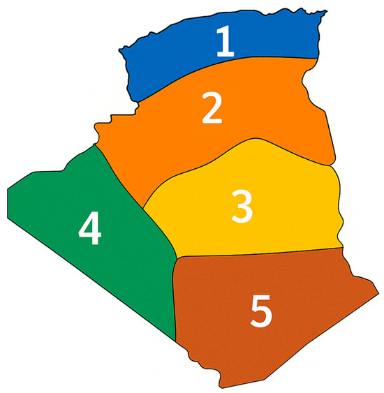 To ensure accurate system assessment, the Algerian map was divided into five studied regions based on three key parameters: solar irradiance, wind speed, and groundwater availability. Region 1 is characterized by low solar irradiance, moderate wind potential, and limited groundwater resources. Region 2 shows gradual improvements in both solar and wind resources, along with slightly higher groundwater availability compared to Region 1. Region 3 is distinguished by exceptionally high wind potential, moderate solar irradiation, and considerable groundwater availability. Region 4 combines high solar irradiation with favorable wind conditions and moderate groundwater availability. Finally, Region 5 exhibits the highest solar irradiation across all regions, variable wind potential, and limited groundwater resources. A techno-economic optimization study was then conducted for each region. Initially, the system was simulated without the deferrable load to estimate the annual hydrogen demand for each region. From a theoretical standpoint, generating 1 kg of hydrogen using electrolysis necessitates around 9 kg of purified water [34]. The annual water requirement was calculated for each region accounting water losses from purification. Subsequently, the average daily energy requirements for groundwater extraction and reverse osmosis were estimated based on average groundwater depths in each region from reference [35] and the corresponding daily water demand for each region. Then, all were included in the deferrable load. Figure 5 shows the studied regions.