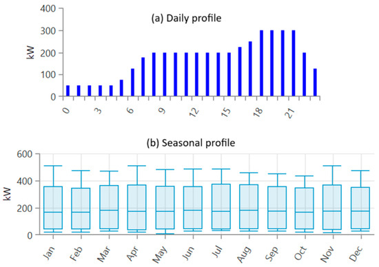 Three distinct load profiles were developed to comprehensively represent the system’s multifaceted energy demands. The first profile related to the electrical load, reflecting the baseline energy consumption required to support general system operations. The electrical load profile was generated based on typical rural microgrid consumption patterns available in HOMER Pro and adjusted to reflect regional microgrid electricity consumption in Algeria. This representation ensures realistic coupling between renewable generation and demand. The estimated electrical load is presented in Figure 6.