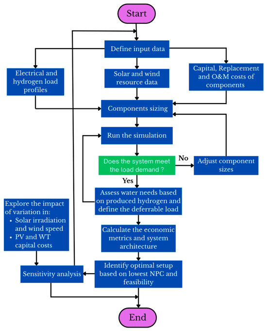 Techno-economic optimization aims to determine the most cost-effective configuration of a system that meets energy demand while minimizing overall costs. It involves simulating different system setups and calculating key economic indicators including net present cost (NPC), levelized cost of energy (LCOE), and levelized cost of hydrogen (LCOH) to compare their performance, in order to select the design that best balances technical reliability with lowest cost. In this study, HOMER Pro version 3.14.2 performs the optimization by following a structured approach as shown in Figure 7, evaluating various combinations to identify the most suitable system design.
