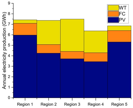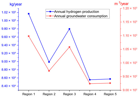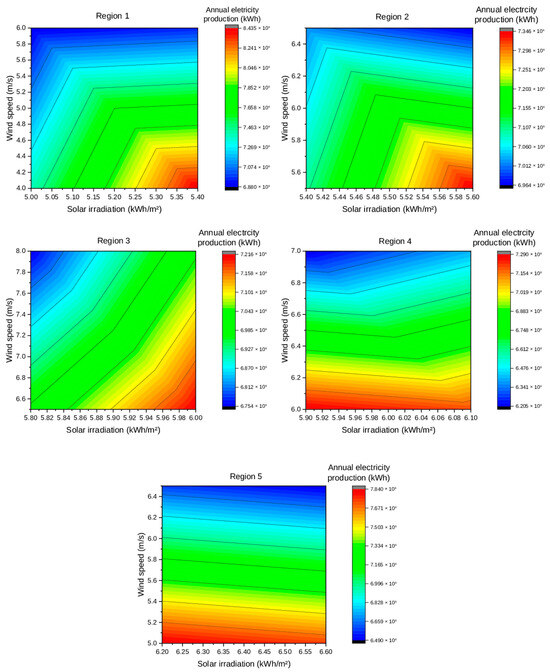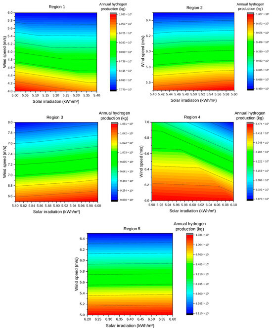 Annual electricity and hydrogen production are also significantly affected by variations in resource availability, primarily due to the need to meet energy demand through PV panels and WTs, as well as to support hydrogen production for energy storage requirements. Figure 16 presents contour plots illustrating the impact of solar irradiation and wind speed on annual electricity production across the five studied regions. In Regions 1, 2, and 3, electricity generation increases with increasing solar irradiation. However, the influence of wind speed varies across these regions. The highest production levels are consistently observed in the bottom-right corner of the plots, corresponding to elevated solar irradiation and low wind speeds. In Region 1, the electricity production remains relatively stable when both resources increase. At higher wind speed values, the contour lines become almost flatter, indicating that further increases in solar irradiation yield negligible increases in electricity generation, which is likely due to system sizing, whereby higher wind speeds lead to a gradual reduction in system size, resulting a decrease in total electricity output. In Region 2, the contour patterns at low solar irradiation levels are comparable to those observed in Region 1. However, beyond a certain threshold the lines slope downward, reflecting a reduction in electricity generation. The threshold tends to shift toward lower solar irradiation values with increasing wind speed. In Region 3, electricity production displays a more uniform pattern. At low levels of solar irradiation and wind speed, the contour lines resemble those in Regions 1 and 2. However, unlike these regions, the generation remains stable as both resources increase, with no decline at higher wind speeds. Instead, a slight increase is observed due to the favorable wind potential in the region. Regions 4 and 5 exhibit distinct patterns, with maximum annual electricity production consistently located along the lower portion of the contour plots, tending toward the left, where both solar irradiation and wind speed show minimum values. In Region 4, electricity production initially decreases with increasing solar irradiation, but it begins to rise beyond a certain threshold, which shifts toward lower levels of solar irradiation as wind speed increases. Region 5 demonstrates the most uniform behavior among all regions, with electricity production consistently declining as solar irradiation and wind speed increase. This trend is primarily attributed to the high levels of solar irradiation, which reduce the need for energy storage, in addition to the low hydrogen demand and the relatively small electrolyzer size, which further limit electricity needs.