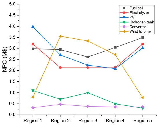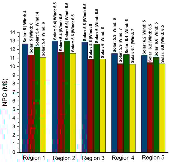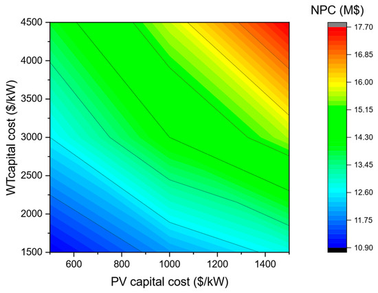Variation in NPC with PV and WT capital costs.