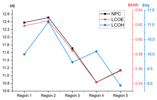 The following section presents the key findings from the techno-economic optimization study of the system. Table 11 summarizes the results, detailing the optimal sizing of system components including the PV panels, wind turbine, electrolyzer, fuel cell, hydrogen tank, and converter across the five studied regions. The optimization outcomes reveal that component sizing is significantly affected by the spatial variability of solar and wind resources and hydrogen demand. Regions with favorable solar irradiation tend to prefer larger PV systems, while improvements in wind conditions are reflected in the increased integration of wind turbines while minimizing the PV system size in global system configurations. The sizes of the electrolyzer and fuel cell remain relatively consistent across the regions, while hydrogen tank size varies based on two main factors: higher hydrogen demand in the region or insufficient solar and wind resources to meet electricity needs, meaning that more hydrogen is needed to supply the fuel cell, resulting larger storage capacity requirements. The converter size also varies depending on the system architecture and the balance between AC and DC, which affects the amount of power that needs to be converted.