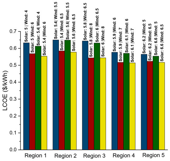Unlike the NPC and LCOE, the LCOH exhibits distinct behavior, as shown in Figure 15, which presents its variation across the five studied regions. In Regions 1 and 5, increasing reliance on wind energy leads to a noticeable rise in the LCOH, primarily due to the low wind potential and high capital cost of wind turbines, which constrain the cost-effectiveness of wind power. Region 1, which has moderate solar resources, shows a remarkable increase in LCOH as wind input increases. In contrast, Region 5 demonstrates lower LCOH values compared to Region 1, attributed to its higher solar irradiation. The greater solar availability in Region 5 reduces reliance on energy storage, resulting in the lowest LCOH values among all regions. Region 2 has slightly better wind conditions than Regions 1 and 5 and exhibits less variation in the LCOH, suggesting a more balanced contribution from both wind and solar resources. Conversely, Regions 3 and 4 display a declining trend in LCOH with increasing wind potential. This trend is particularly evident in Region 3, where the LCOH decreases consistently as both solar irradiation and wind speed rise, reaching its smallest value when both resources are at their highest levels, reflecting the strong wind potential in this region. Region 4 shows a similar pattern with respect to wind, where the LCOH continues to increase with higher solar irradiation.