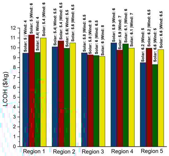 LCOH variation across the five studied regions under different solar irradiation (kWh/m2) and wind speed (m/s).