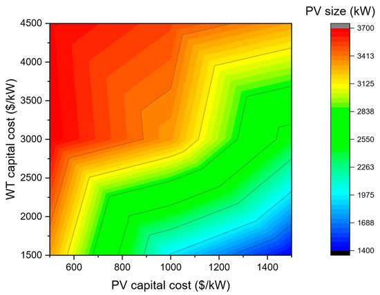 Variation in PV size with PV and WT capital costs.