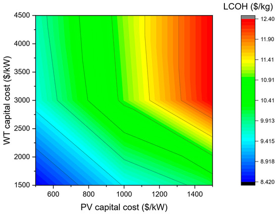 Variation in LCOH with PV and WT capital costs.